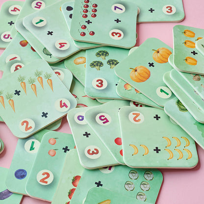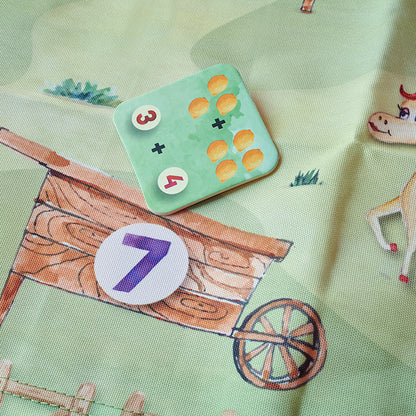 GAMEPLAY - Encourage your child to use simple addition and counting to sum up the fruits and vegetables on the tiles, and walk around the mat placing them on the correct numbers!